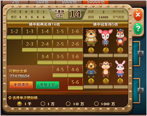 2) 游戏右侧为投注冠军,鼠标点击投注该对应号码(的动物),下方显示自己的投注金额。